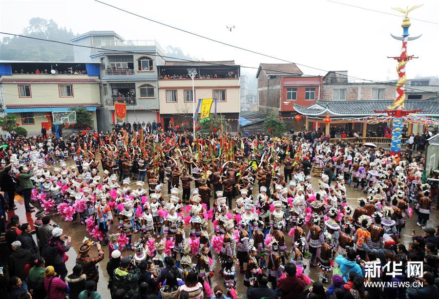 2月7日,廣西融水苗族自治縣安太鄉(xiāng)苗族群眾開展傳統(tǒng)的“打同年”民俗活動。當(dāng)?shù)財?shù)百名苗族同胞與游客們歡聚一堂,一起開展對歌、蘆笙踩堂、文藝晚會等活動,歡慶新春佳節(jié)。 “打同年”是融水苗族村寨的一種民俗,即友好村寨之間的拜年聯(lián)歡活動。新華社記者 李斌 攝