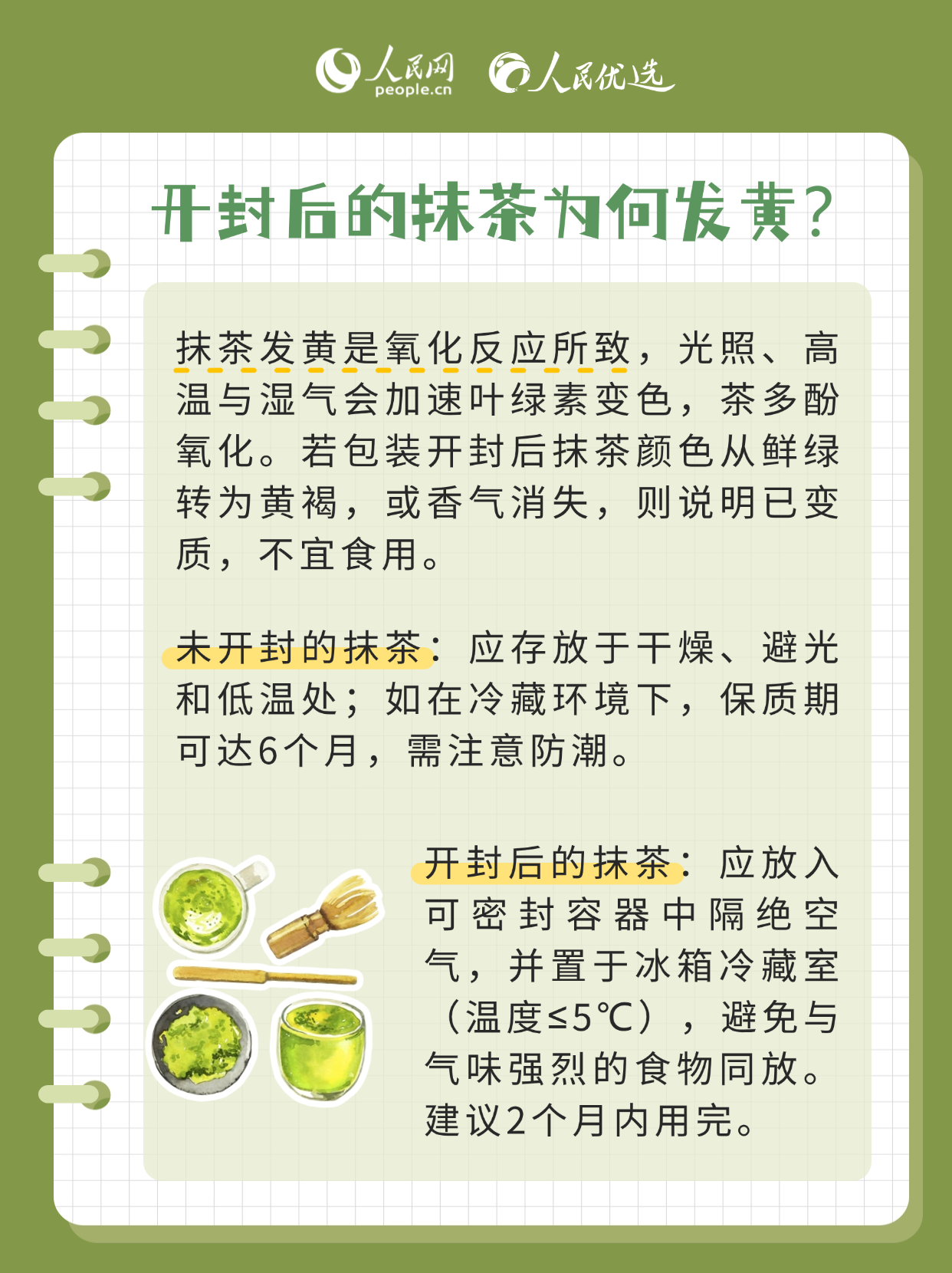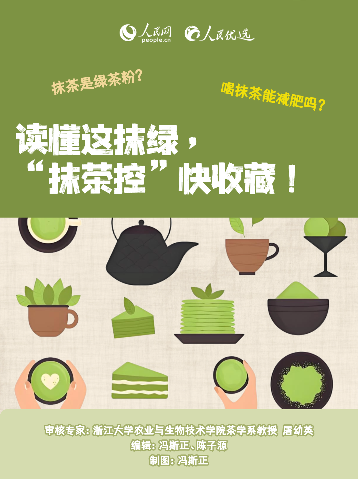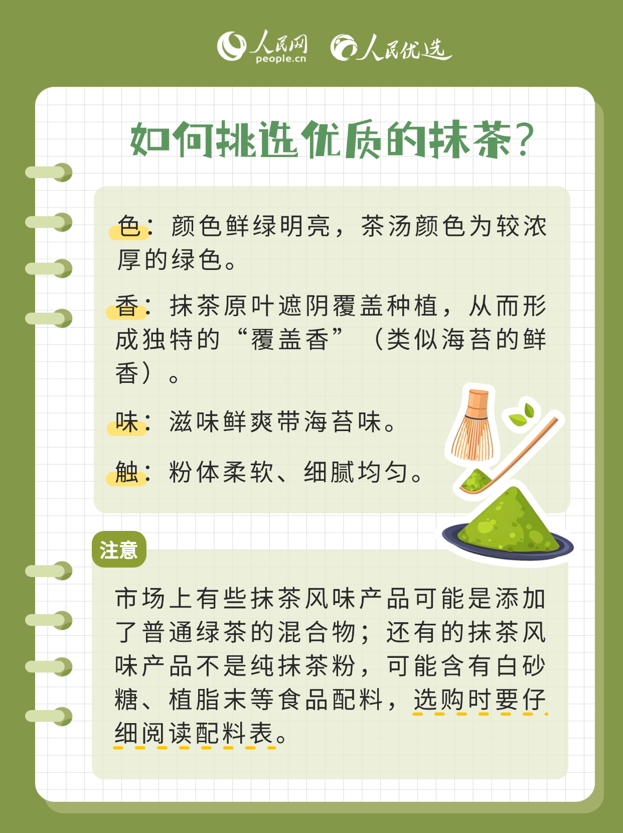 抹茶因香氣獨特、口感層次豐富、色澤翠綠悅目,受到很多人的喜愛。市面上抹茶冰淇淋、抹茶蛋糕、抹茶飲品等各種抹茶風味制品層出不窮。抹茶到底是什么茶?選購抹茶應留意什么?本期《人民優(yōu)選來了》,帶您讀懂這抹綠。