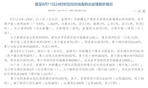 國家衛(wèi)健委:8月11日新增確診病例25例 其中本土病例9例