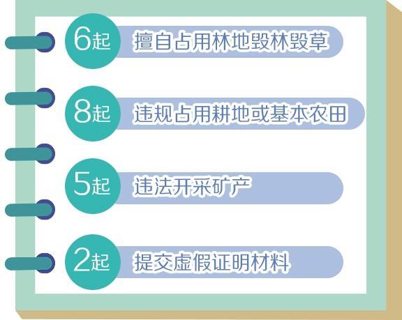 有8起違規(guī)占用耕地或基本農(nóng)田:包括內(nèi)蒙古愷鑫農(nóng)牧業(yè)科技有限公司種植綠化裝飾草皮違規(guī)占用永久基本農(nóng)田459.20畝;上海市金山區(qū)楓涇鎮(zhèn)對占用破壞69.63畝耕地問題監(jiān)管不力;江蘇省鎮(zhèn)江市句容市天王鎮(zhèn)政府及市相關(guān)部門未如實上報種植綠化裝飾草皮違規(guī)占用永久基本農(nóng)田問題;湖北省荊州市綠普綠化工程有限公司種植綠化裝飾草皮違規(guī)占用永久基本農(nóng)田340.49畝;廣東省茂名市高州市深德旅游發(fā)展有限公司侵占耕地47.24畝挖湖造景等。