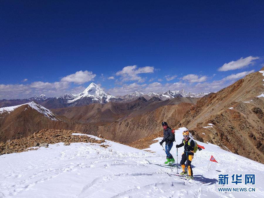↑這是10月4日,滑雪愛好者、“體育旅游”探索者劉百靈(左)在位于西藏自治區(qū)當雄縣羊八井鎮(zhèn)的洛堆峰雪坡上進行練習,此處海拔約5700米。遠處的山峰是海拔6010米的洛堆峰。 新華社發(fā)