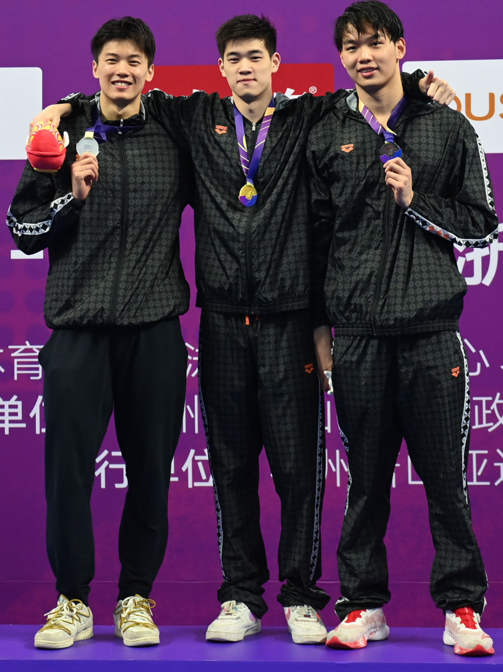 5月4日,分獲男子200米自由泳前三名的浙江隊(duì)選手潘展樂(中)、汪順(左)和洪金權(quán)在頒獎(jiǎng)儀式上合影。新華社記者黃宗治攝