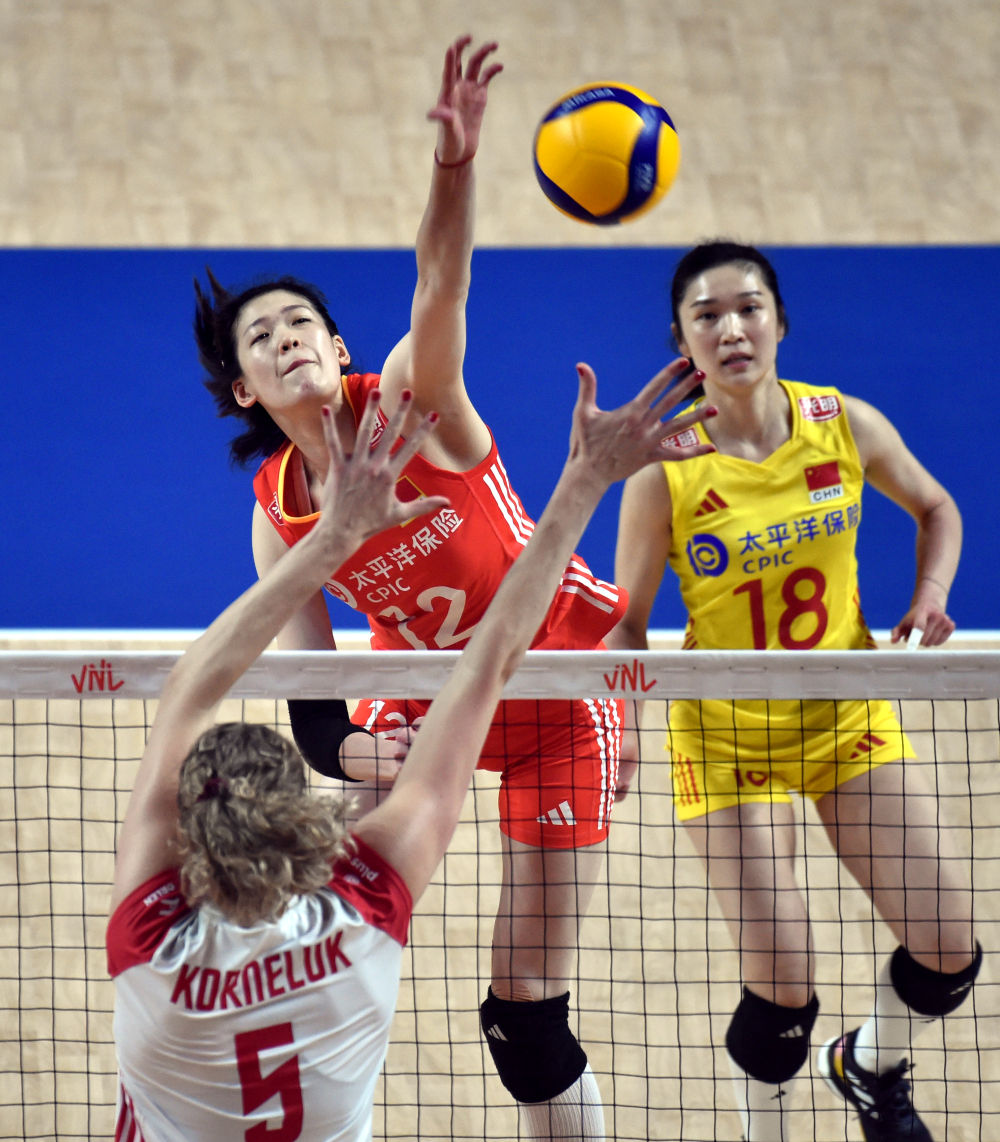6月16日,中國隊(duì)球員袁心玥(中)在比賽中吊球。新華社記者 盧炳輝 攝