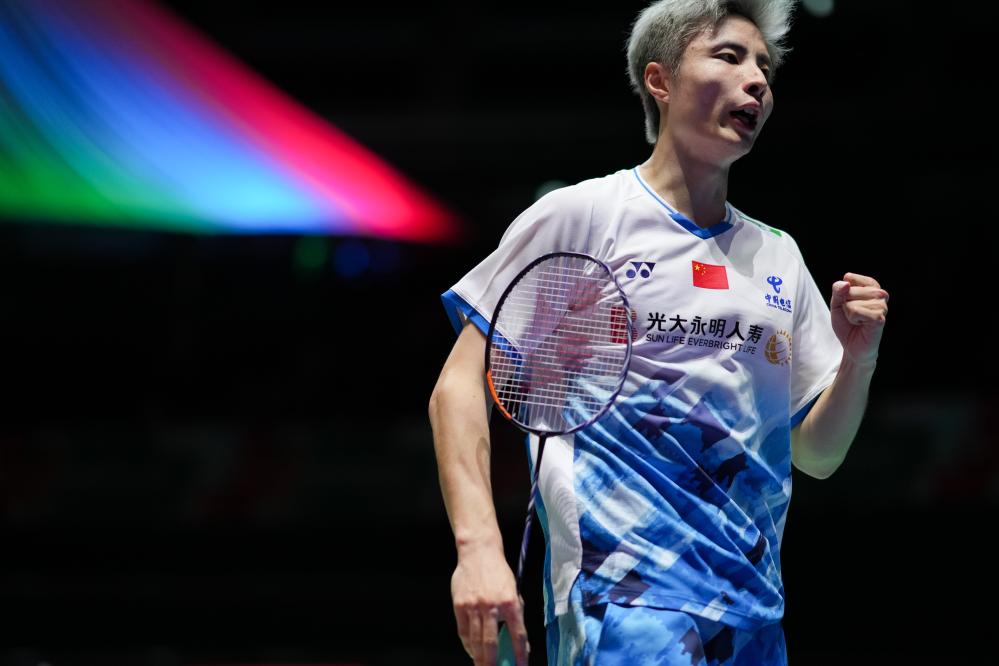 8月22日,石宇奇在比賽中慶祝得分。新華社記者 張笑宇 攝