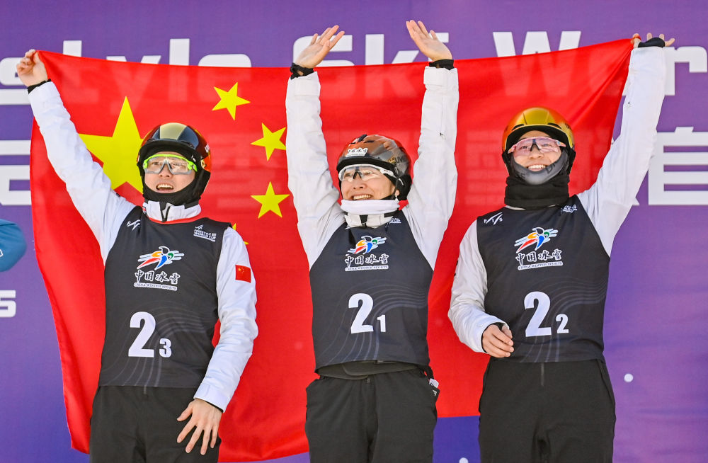 2月24日,在2024-2025賽季國際雪聯(lián)自由式滑雪世界杯(北大湖站)空中技巧混合團(tuán)體決賽中,由徐夢桃、李天馬、齊廣璞組成的中國一隊(duì)獲得金牌。圖為中國一隊(duì)徐夢桃(中)、李天馬(右)、齊廣璞在頒獎(jiǎng)儀式上。新華社記者 顏麟蘊(yùn) 攝