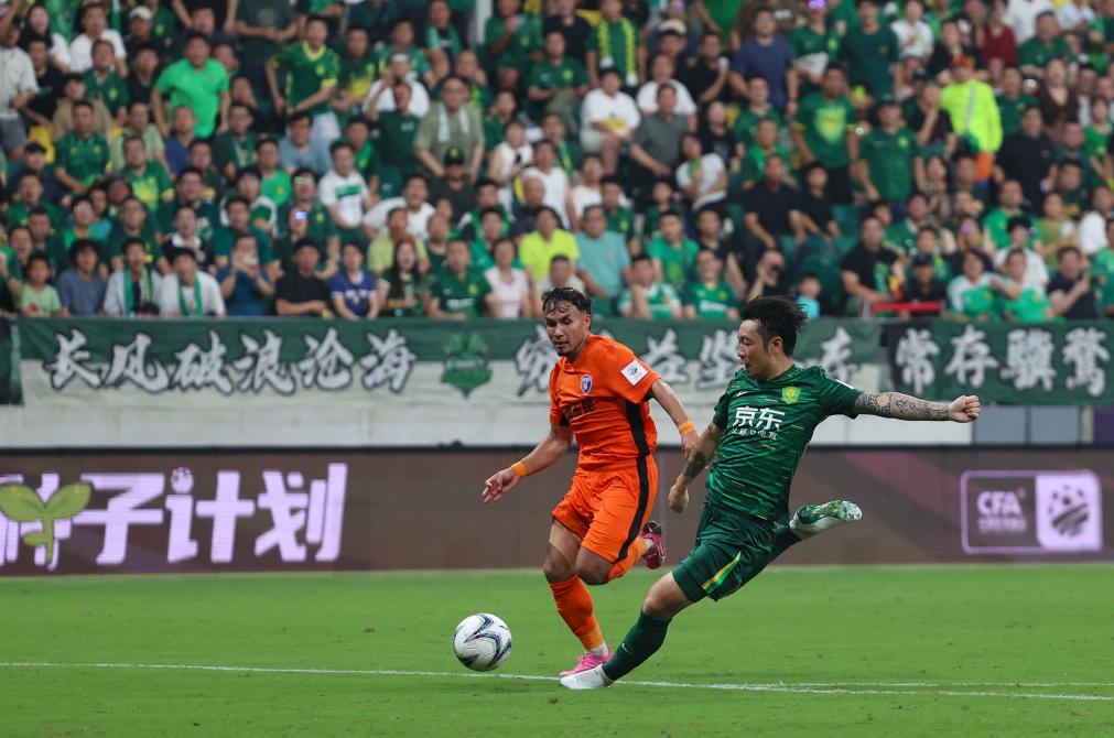 第38分鐘,老將王剛在右路突入禁區(qū)后勁射破門,幫助北京國安取得兩球領(lǐng)先。上半場補(bǔ)時(shí)階段,北京國安乘勝追擊,外援古加在禁區(qū)內(nèi)推射,再入一球。