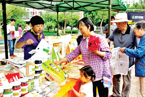糧油配送中心工作人員在世紀花苑小區(qū)向居民展示健康食品