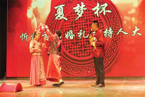 李忠憲參加忻州首屆婚禮主持人大賽的作品是《地域風情(民俗·佛樂)》。他介紹作品時說:“當我得知自己進入決賽時,我突然想起今年《人說山西好風光》山西旅游發(fā)展大會上我市領導的講話,講話樸實誠懇,讓我印象深刻。決定了這個方案后,我找到當時的視頻,一字一句把領導的講話寫了下來。按照這個思路我展開了想象(五臺圣境·雁門雄風·蘆芽美景·黃河風情),想到山西的母親河,汾河源頭寧武與八音之鄉(xiāng)定襄,當住在汾河源頭的小伙遇到聽著民樂長大的姑娘時,小伙的心融化了,為了得到定襄姑娘的芳心,小伙下決心學會了吹嗩吶,就這樣你來我往,情定今生。因為在傳統(tǒng)婚禮中有交杯酒之類的儀式,所以在這個環(huán)節(jié)我選擇了將汾河源頭的福水,與充盈著定襄鍛造神韻并感染了佛國靈性的貫流之水合二為一,最后我想到了五臺山,有了佛光普照,為新人祈福,為蒼生庇佑的想法,于是出現(xiàn)了新人手持蓮花寶燈,全場嘉賓雙手合十,祈福庇佑的場景?!?/p>