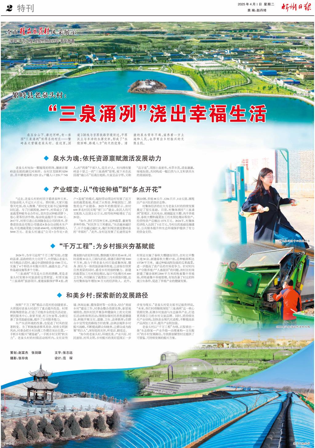 “如今的老泉頭村,環(huán)境優(yōu)美、產(chǎn)業(yè)興旺、村民富裕、村風(fēng)文明,鄉(xiāng)村振興的美好藍(lán)圖正一步步變?yōu)楝F(xiàn)實(shí)?!崩先^村黨支部書(shū)記崔貴祥說(shuō),“未來(lái),我們村將繼續(xù)深挖‘三泉涌冽’這一核心資源優(yōu)勢(shì),拓展鄉(xiāng)村旅游與生態(tài)康養(yǎng)產(chǎn)業(yè),打造更具吸引力的鄉(xiāng)村文旅品牌。同時(shí),將持續(xù)優(yōu)化產(chǎn)業(yè)結(jié)構(gòu),加快農(nóng)業(yè)現(xiàn)代化進(jìn)程,不斷提高農(nóng)產(chǎn)品深加工水平,提升產(chǎn)業(yè)附加值。