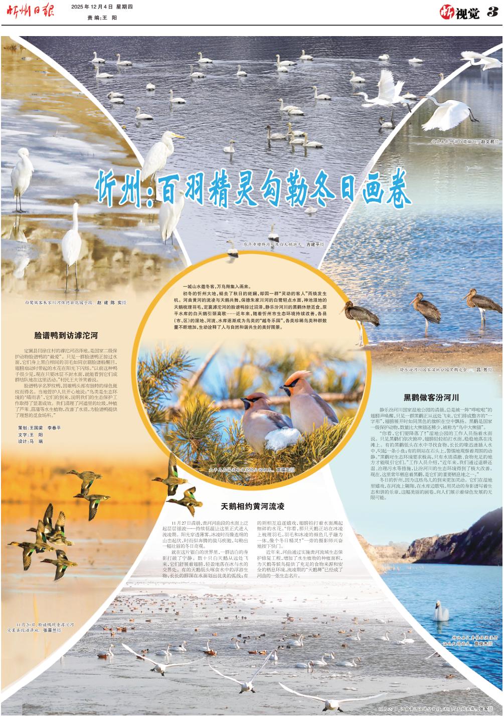 初冬的忻州大地,褪去了秋日的斑斕,卻因一群“靈動(dòng)的客人”而煥發(fā)生機(jī)。河曲黃河的流凌與天鵝共舞,保德朱家川河的白鷺輕點(diǎn)水面,神池濕地的天鵝梳理羽毛,定襄滹沱河的臉譜鴨掠過(guò)沼澤,靜樂(lè)汾河川的黑鸛休憩覓食,原平水庫(kù)的白天鵝引頸高歌……近年來(lái),隨著忻州市生態(tài)環(huán)境持續(xù)改善,各縣(市、區(qū))的濕地、河流、水庫(kù)逐漸成為鳥(niǎo)類(lèi)的“越冬樂(lè)園”,各類(lèi)珍稀鳥(niǎo)類(lèi)種群數(shù)量不斷增加,生動(dòng)詮釋了人與自然和諧共生的美好圖景。