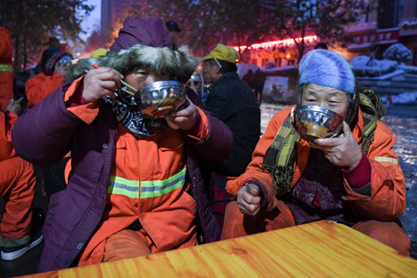 圖說(shuō):在鄭州市廣電南路愛(ài)心粥屋,環(huán)衛(wèi)工人們?cè)趷?ài)心粥屋吃早飯(11月23日攝)。圖片來(lái)源:新華社