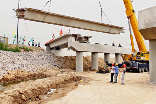 據(jù)了解,牧馬河大橋自開工以來,承擔大橋施工任務的太原市政總公司的建設(shè)者們?yōu)楸4髽蚰馨磿r、按質(zhì)、按量建成而日夜奮戰(zhàn),每天投入100多個工人,分“ 三班”倒施工。據(jù)介紹,目前,大橋進入橋面鋪設(shè)階段,工人們每天幾乎進行的是水、陸、空立體施工。從25日一早開始,1臺大型拖車將1公里外預制的箱梁運來,1臺大型吊車每天張開巨大吊臂在高空輸送箱梁,每個箱梁長為20米、重約60噸,整個橋面共由70塊箱梁組成。據(jù)現(xiàn)場施工技術(shù)人員介紹,過去的牧馬河橋長130米,寬僅有8.5米,嚴重制約著南北向車輛通行。新建的大橋長為140米,7跨30米寬,設(shè)計為雙向四車道。