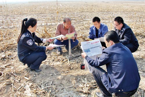 為了將《中華人民共和國大氣污染防治法》和《五臺縣人民政府嚴防森林火災的通告》宣傳到戶、到人,五臺縣環(huán)保局組織工作人員,分組劃片深入到田間地頭,面對面讀報給農(nóng)民聽,為農(nóng)民解釋燒秸稈、燒荒等野外違規(guī)用火行為的危害。臺城鎮(zhèn)西關(guān)村66歲的農(nóng)民張存在說:“你們這樣解釋,咱懂。我家4畝地的秸稈保證不燒一根?!眻D為五臺縣環(huán)保局工作人員在田間地頭宣傳環(huán)境保護相關(guān)知識。(金俊賢 辛宇 攝影報道)