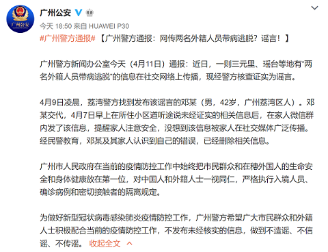 廣州警方新聞辦公室4月11日通報:近日,一則三元里、瑤臺等地有“兩名外籍人員帶病逃脫”的信息在社交網(wǎng)絡(luò)上傳播,現(xiàn)經(jīng)警方核查證實為謠言。
