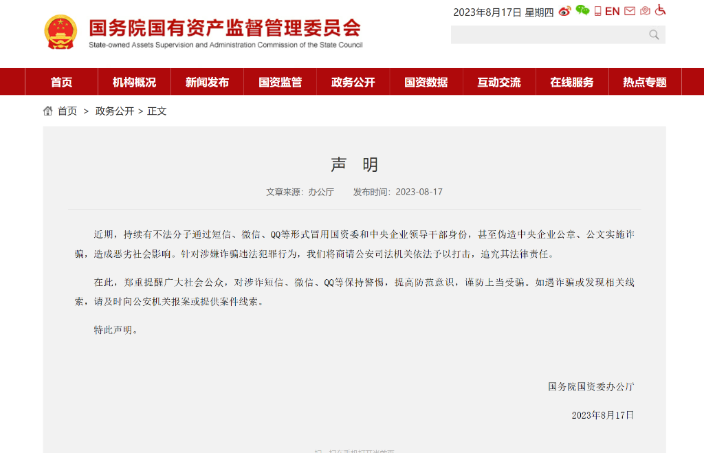 國(guó)務(wù)院國(guó)資委辦公廳8月17日在國(guó)務(wù)院國(guó)資委官網(wǎng)發(fā)布聲明稱,近期,持續(xù)有不法分子通過(guò)短信、微信、QQ等形式冒用國(guó)務(wù)院國(guó)資委和中央企業(yè)領(lǐng)導(dǎo)干部身份,甚至偽造中央企業(yè)公章、公文實(shí)施詐騙,造成惡劣社會(huì)影響。針對(duì)涉嫌詐騙違法犯罪行為,國(guó)務(wù)院國(guó)資委將商請(qǐng)公安司法機(jī)關(guān)依法予以打擊,追究其法律責(zé)任。