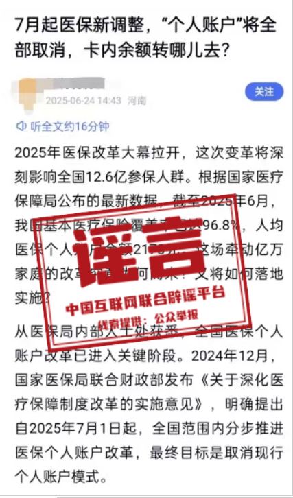 詳情:近日,一篇題為《7月起醫(yī)保新調(diào)整,“個(gè)人賬戶”將全部取消,卡內(nèi)余額轉(zhuǎn)哪里去?》的自媒體文章引起較多關(guān)注。文中宣稱“從醫(yī)保局內(nèi)部人士處獲悉,全國醫(yī)保個(gè)人賬戶改革已進(jìn)入關(guān)鍵階段”“自2025年7月1日起,全國范圍內(nèi)分步推進(jìn)醫(yī)保個(gè)人賬戶改革,最終目標(biāo)是取消現(xiàn)行個(gè)人賬戶模式”。