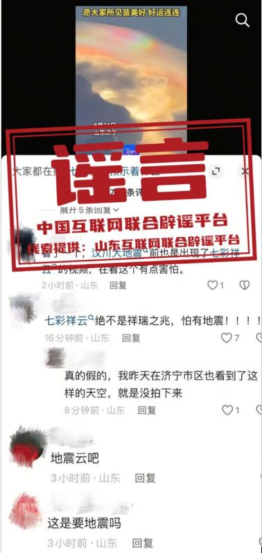 真相:近日,山東濟(jì)寧多地市民觀察到天空中出現(xiàn)大片色彩斑斕、形態(tài)似羽毛或波浪的云層,許多人稱之為“祥云”,有部分網(wǎng)民將它與“地震預(yù)測”的民間說法相關(guān)聯(lián),稱是“地震云”“不是祥瑞之兆,是要地震”。
