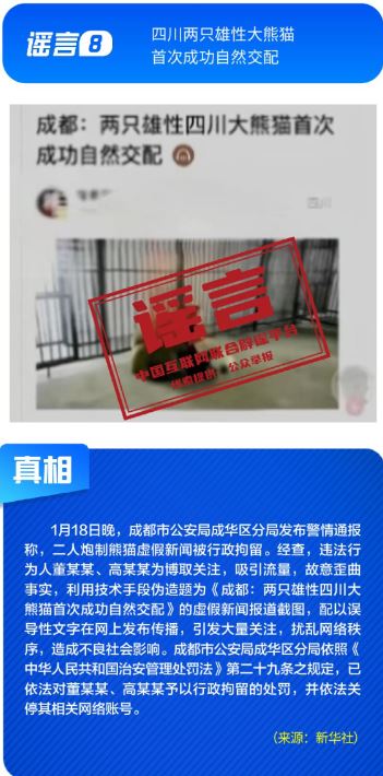 ??針對(duì)各類網(wǎng)絡(luò)謠言與亂象,多部門開展協(xié)同治理,聯(lián)動(dòng)整治。1月16日,中央網(wǎng)信辦召開全國(guó)網(wǎng)絡(luò)辟謠聯(lián)動(dòng)機(jī)制第三次全體會(huì)議,部署以辟謠工作新成效助力清朗網(wǎng)絡(luò)空間建設(shè)。中央網(wǎng)信辦聯(lián)合工業(yè)和信息化部等部門持續(xù)整治汽車行業(yè)網(wǎng)絡(luò)亂象,處置一批涉嫌挑動(dòng)對(duì)立、炒作負(fù)面話題、違規(guī)測(cè)評(píng)的賬號(hào);國(guó)家廣播電視總局開展“AI魔改”視頻專項(xiàng)治理,各平臺(tái)處置大量違規(guī)內(nèi)容。各地網(wǎng)信部門積極行動(dòng),陜西西安深入開展房地產(chǎn)領(lǐng)域網(wǎng)絡(luò)專項(xiàng)行動(dòng),處置散布樓市謠言的房產(chǎn)中介賬號(hào),四川成都依法處置30余個(gè)惡意關(guān)聯(lián)地域、污名化城市的違規(guī)賬號(hào)。公安機(jī)關(guān)依法打擊造謠傳謠人員。擺拍“小女孩在學(xué)校跳蚤市場(chǎng)用50元淘到名酒”、利用AI偽造“假救護(hù)車非法轉(zhuǎn)運(yùn)”、編造“兩只雄性四川大熊貓首次成功自然交配”等謠言的相關(guān)責(zé)任人已依法被予以行政處罰。