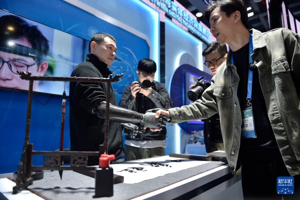 在展位現(xiàn)場,另一名上肢截肢的人士在使用強(qiáng)腦科技推出的智能仿生手。這也是基于非侵入式腦機(jī)接口技術(shù)的產(chǎn)品。使用者利用智能仿生手不但可輕松取物,還能寫毛筆字。