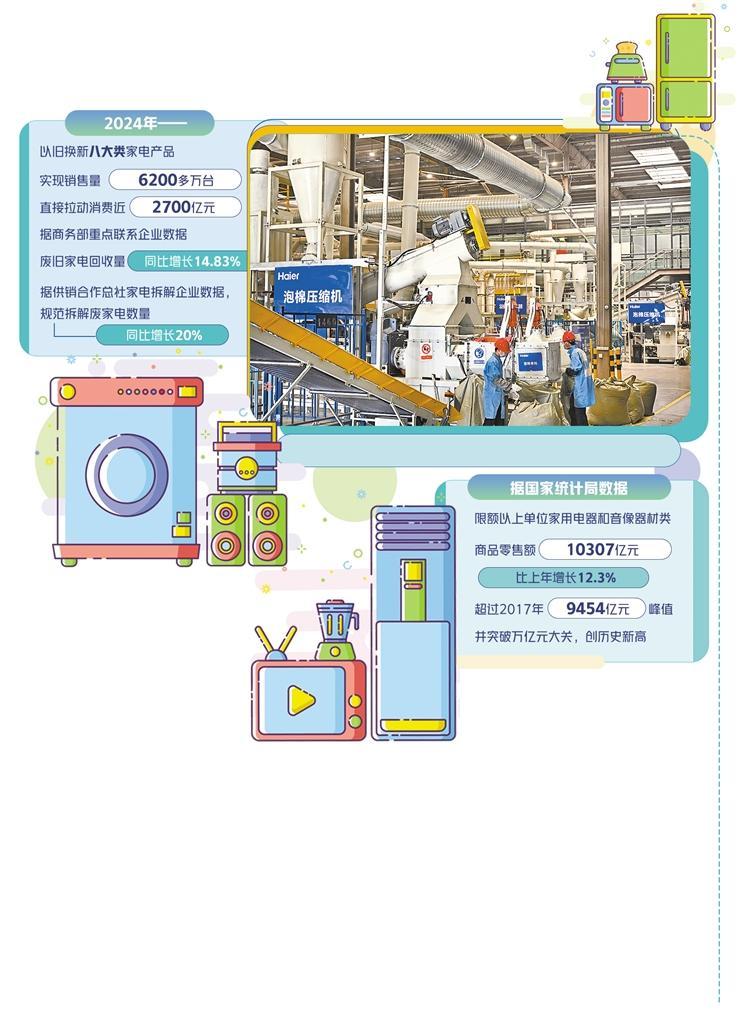 自《推動(dòng)大規(guī)模設(shè)備更新和消費(fèi)品以舊換新行動(dòng)方案》(以下簡(jiǎn)稱《行動(dòng)方案》)實(shí)施以來(lái),家電市場(chǎng)消費(fèi)潛力得到顯著釋放。數(shù)據(jù)顯示,2024年,中央加力支持以舊換新八大類家電產(chǎn)品實(shí)現(xiàn)銷售量6200多萬(wàn)臺(tái),直接拉動(dòng)消費(fèi)近2700億元。日前,國(guó)家發(fā)展改革委副主任趙辰昕在國(guó)務(wù)院政策例行吹風(fēng)會(huì)上介紹,2025年將延續(xù)并加力擴(kuò)圍實(shí)施“兩新”政策,享受以舊換新補(bǔ)貼的家電產(chǎn)品種類由2024年的8類增至12類,單件最高補(bǔ)貼可達(dá)銷售價(jià)格的20%。