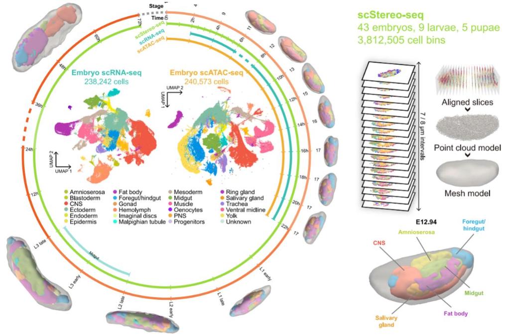 杭州華大生命科學(xué)研究院與南方科技大學(xué)創(chuàng)建了一個(gè)解碼動(dòng)物發(fā)育過程的多模態(tài)數(shù)據(jù)集,生成了果蠅全發(fā)育周期的3D單細(xì)胞時(shí)空多組學(xué)圖譜,為生物發(fā)育提供了分子層面的參考,有望為發(fā)育缺陷及相關(guān)疾病機(jī)制研究奠定基礎(chǔ)。相關(guān)成果26日發(fā)表于國際學(xué)術(shù)期刊《細(xì)胞》。