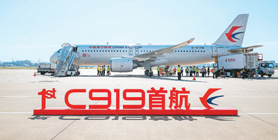 5月28日,國(guó)產(chǎn)大飛機(jī)C919迎來商業(yè)航班首飛。王 初攝(人民圖片)