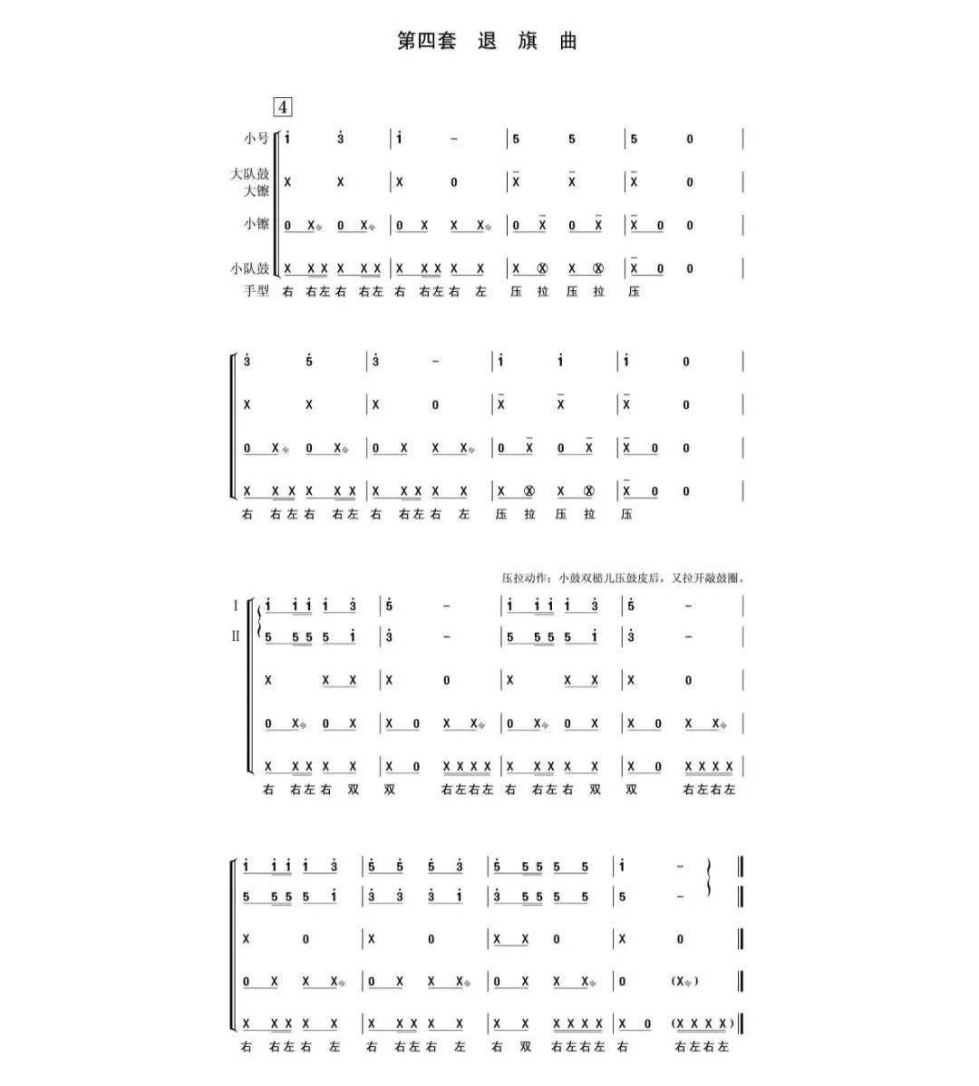 少先隊(duì)鼓號隊(duì)總譜除間奏鼓外共10套曲目,包括:開場曲、進(jìn)行曲、出旗曲、退旗曲、頒獎(jiǎng)曲、授巾曲、檢閱曲、宣誓曲、迎賓曲、歡送曲。