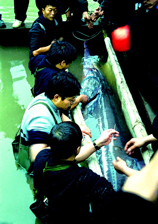 ▲2003年1月27日,在四川宜賓主城區(qū)附近的長江岸邊,專家正在對一只白鱘進行救治,這只白鱘是一位漁民在涪溪口發(fā)現(xiàn)的。