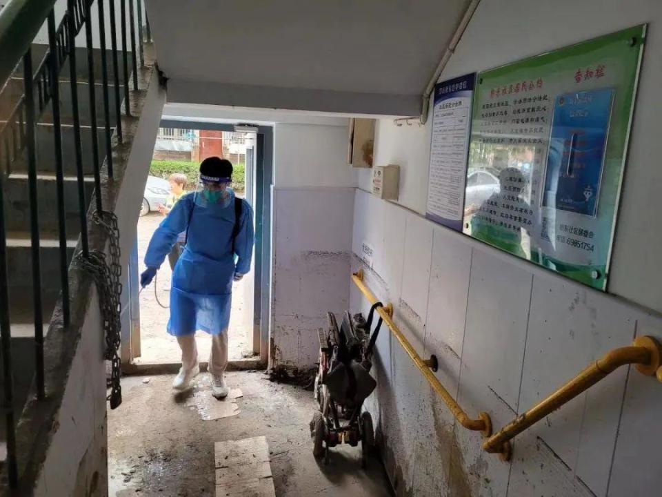 “益行志愿服務隊從8月4日17點下班后開始組織救災工作,到凌晨24點充分準備完畢。總計出動9輛汽車,志愿者們對社區(qū)內(nèi)的一樓單元門口、垃圾分類驛站、居民家里、黨群活動中心、居委會物資庫、社區(qū)花園內(nèi)和道路,開展清理淤泥和清洗路面工作?!睆垈惤榻B道。