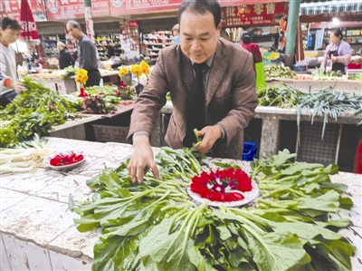 他用鮮花點(diǎn)綴菜攤