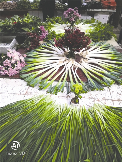 天剛蒙蒙亮,攀枝花市東區(qū)九附六菜市場里已經(jīng)人頭攢動,王美成將菜擺在攤位上,然后擺成各種形狀,再用鮮花裝扮一番,與他人的菜攤形成鮮明對比。