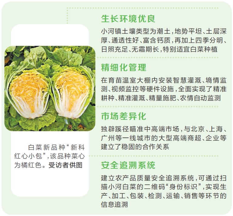 “小河白菜跳出‘白菜價(jià)’,我們最大的底氣便是好的品種培育?!本G源農(nóng)牧總經(jīng)理張躍民介紹,他從2008年開始流轉(zhuǎn)600余畝土地規(guī)模化種植小河白菜,品種大部分來自新鄉(xiāng)市農(nóng)科院蔬菜研究團(tuán)隊(duì)。往年該公司主要種植的白菜品種為“新科小包26”,一棵也能賣到39元。