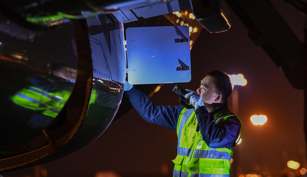 1月11日,在??诿捞m國際機場停機坪上,南航工程技術分公司機務工程師對飛機進行深度檢查。新華社記者 楊冠宇 攝