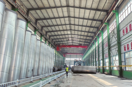 韓建河山朔州分公司生產(chǎn)車間,等待試壓檢驗的鋼筒。