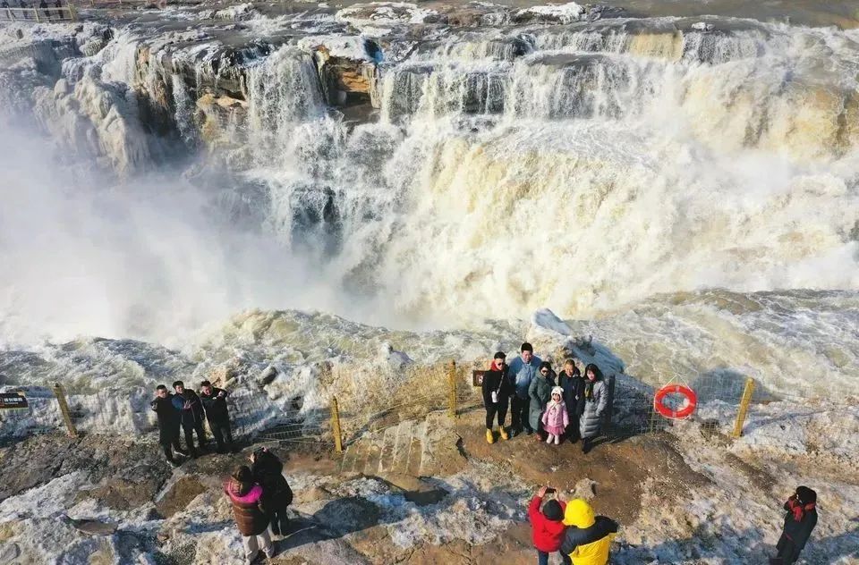 ▲2月9日,游客在吉縣黃河壺口瀑布游覽觀瀑?!傲⒋骸焙?,受氣溫回暖影響,吉縣黃河壺口瀑布冰消河開,再現(xiàn)奔騰咆哮的壯美景觀。呂桂明攝