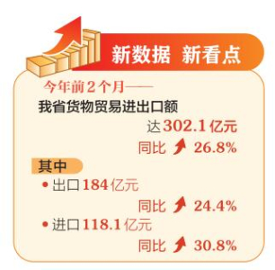 從貿易伙伴看,前2個月,美國、東盟、歐盟、日本、我國臺灣地區(qū)成為我省前五大貿易市場,同比分別增長45.8%、34.5%、26.3%、5%和23.9%。同期,與共建“一帶一路”國家進出口136億元,同比增長36.2%,占全省進出口總值的45%;對RCEP成員國進出口95.8億元,同比增長22.9%。