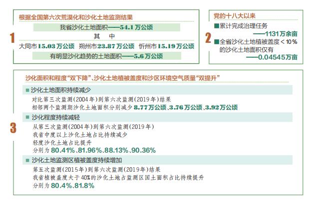 荒漠化是影響人類生存和發(fā)展的全球性重大生態(tài)問題。我省晉西北和晉北地區(qū)是全國荒漠化監(jiān)測與防治的重點地區(qū)之一。經(jīng)過長期積極探索,不斷創(chuàng)新機(jī)制和科學(xué)防沙治沙,我省實現(xiàn)了沙化面積和程度“雙下降”、沙化土地植被蓋度和沙區(qū)環(huán)境空氣質(zhì)量“雙提升”的實際成效。