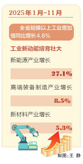 數(shù)據(jù)顯示,2025年1月—11月,全省規(guī)模以上工業(yè)增加值同比增長4.6%,工業(yè)新動能培育壯大,新能源產(chǎn)業(yè)增長27.1%,高端裝備制造產(chǎn)業(yè)增長8.5%,新材料產(chǎn)業(yè)增長5.3%,為全省經(jīng)濟(jì)發(fā)展提供了堅實支撐。