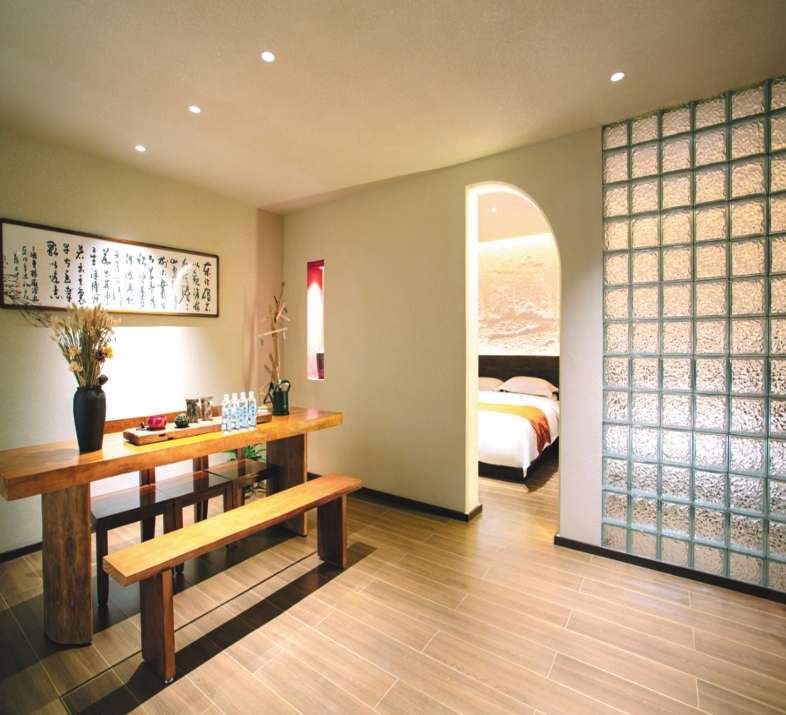 牧瑤溫泉民宿位于忻府區(qū)南關(guān)村。走進(jìn)院內(nèi),大片玻璃窗通透明亮,門前蒼松與其他綠植讓人心曠神怡,潺潺流水和中式亭子的造景,增添了許多的靈動(dòng)韻味。