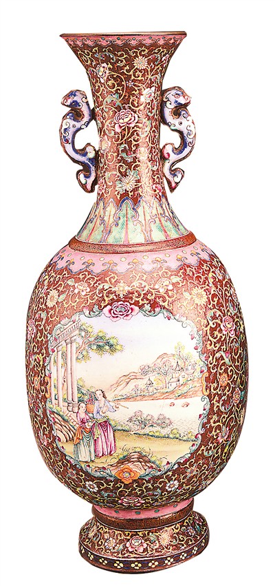 清代廣州畫琺瑯纏枝花卉山水人物紋雙耳瓶