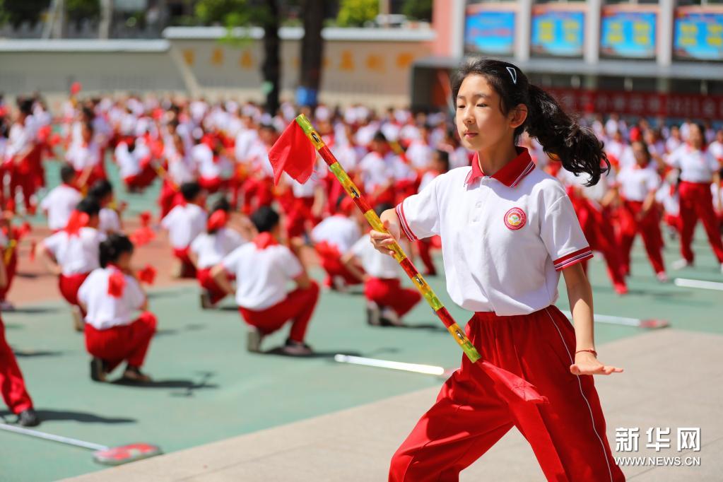 6月10日,在承德市雙橋區(qū)南營子小學(xué),學(xué)生在大課間上練習(xí)“霸王鞭”。近年來,河北省承德市雙橋區(qū)南營子小學(xué)以開展“陽光大課間”為平臺(tái),將非遺民間舞蹈“霸王鞭”融入學(xué)校素質(zhì)教育實(shí)踐中,通過聘任專業(yè)老師,開設(shè)“霸王鞭”體育運(yùn)動(dòng)社團(tuán),引導(dǎo)小學(xué)生在大課間上練習(xí)“霸王鞭”,增強(qiáng)體質(zhì),傳承非遺。新華社發(fā)(劉環(huán)宇 攝)