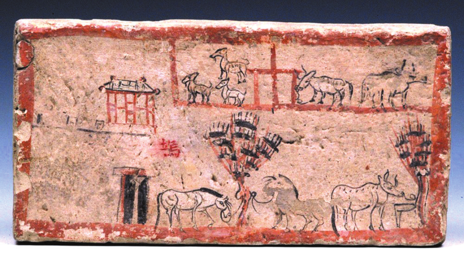 塢壁是東漢時(shí)期極具特色的建筑,由于當(dāng)時(shí)地方豪強(qiáng)勢(shì)力急速發(fā)展,廣泛兼并土地,蔭庇宗族與賓客,形成自己的武裝與生產(chǎn)力量,逐漸出現(xiàn)了塢、屯、壁、堡、壘、營(yíng)、寨等集生產(chǎn)、生活、軍事為一體的建筑,閉門(mén)成市,后來(lái)在魏晉時(shí)期發(fā)揚(yáng)光大。嘉峪關(guān)長(zhǎng)城博物館藏的一塊畫(huà)像磚,磚面左側(cè)繪一小城,城墻上筑雉堞,城門(mén)上建譙樓,榜題“塢”字,塢外繪有兩株樹(shù),還有一群牛馬羊在悠閑吃草,形象再現(xiàn)了塢的建筑形制。
