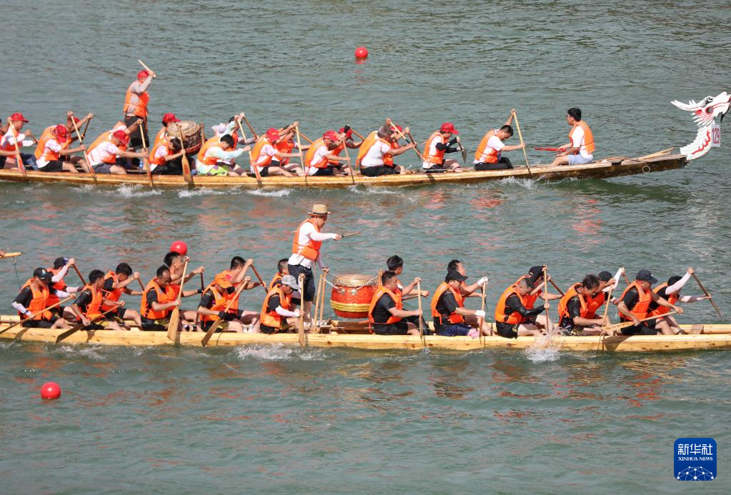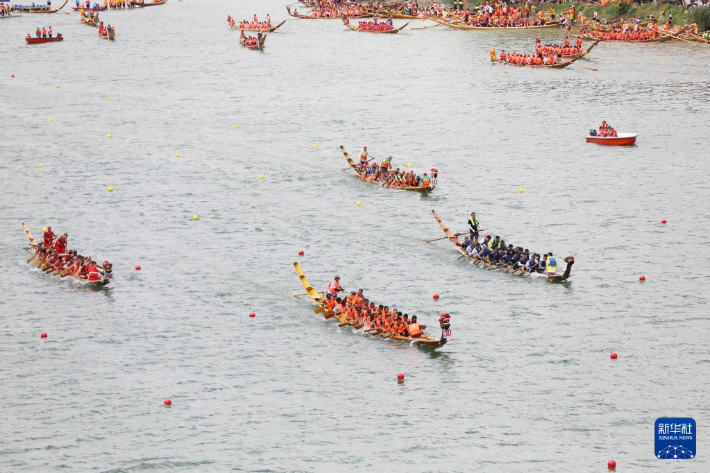 端午節(jié)臨近,湖南道縣舉行非遺龍船賽,眾多龍船在瀟水河上競渡,迎接佳節(jié)到來。新華社發(fā)(蔣克青 攝)