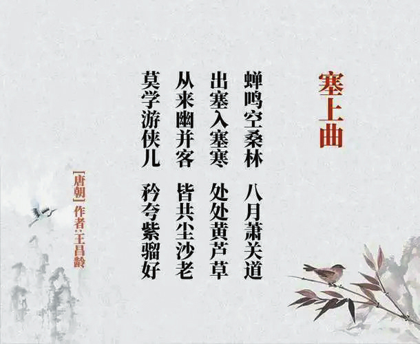 《塞上曲》唐(王昌齡):“蟬鳴空桑林,八月蕭關(guān)道。出塞入塞寒,處處黃蘆草。從來幽并客,皆共塵沙老。莫學游俠兒,矜夸紫騮好?!痹娭械娜?、塞下,說穿了就是關(guān)外和關(guān)內(nèi)。但,其實景象沒什么特別,黃云、風沙、駿馬、朔雪、美酒、桑林、關(guān)道、蘆草、沙場,也似乎只有這些才能更符合邊塞詩人的審美。而“雁門關(guān)”成了李頎、王昌齡這對好友的共同命題。