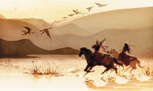 從詩仙手中接過筆的是“詩鬼”。李賀豪情萬丈,大筆一揮,筆走龍蛇,一幅巨作石破天驚,橫空出世。之所以說是一幅巨作,是因為李賀筆下的這首詩的確太像一幅畫了:“黑云壓城城欲摧,甲光向日金鱗開。角聲滿天秋色里,塞上燕脂凝夜紫。半卷紅旗臨易水,霜重鼓寒聲不起。報君黃金臺上意,提攜玉龍為君死。”