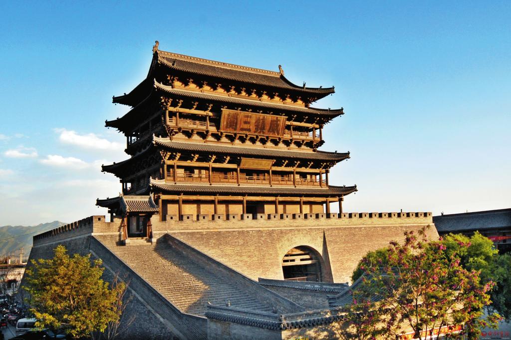 萬里長城第一樓——代縣古城邊靖樓。明洪武七年(1374年)始建,成化十二年(1476年)重建,由磚券洞臺基和三層四檐歇山頂樓身組成,基底東西長43.3米,南北寬33.3米,臺高13.3米。樓身高26.7米,總高度達到40米。樓身面闊7間29.65米,進深5間19.30米。二層檐柱之上施五踩重翹斗拱,三層檐下施五踩重昂。每層四周呈上下重疊柱網(wǎng)布局,四周圍廊,別具特色。斗拱非常規(guī)整,梁架精致奇巧,建造恢宏威嚴,是中國最大的木質(zhì)鼓樓,比山海關(guān)靖邊樓高15米,比嘉峪關(guān)城樓高17米,比天安門高5.3米,被長城專家考定為萬里長城第一樓。