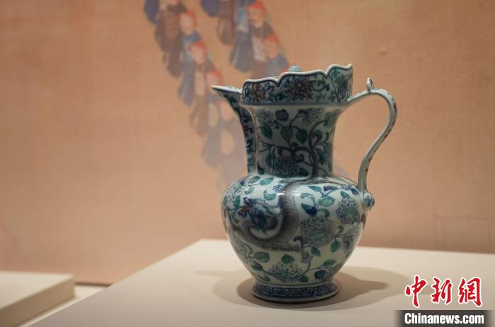 2月27日,正在“御瓷歸來”展覽上展出的“清乾隆時期斗彩螭龍穿花紋僧帽壺”。 劉思偉 攝