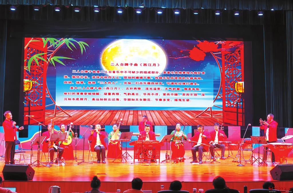 由河曲縣文化和旅游局選送、河曲縣民歌二人臺(tái)藝術(shù)團(tuán)演奏的二人臺(tái)牌子曲《巴音杭蓋》,是一首標(biāo)題性器樂(lè)曲。從曲式上看,屬“多基腔板式變化體”,由“慢板”“流水板”“捏字板”3種板式構(gòu)成;從音調(diào)上看,滲入了內(nèi)蒙古民間器樂(lè)元素,并使用了“清角為宮”的手法,使其在總的徵調(diào)式基礎(chǔ)上具有了多宮調(diào)、多調(diào)式因素而形成動(dòng)力性和展開(kāi)性。演奏中,全體演奏員配合默契,充分運(yùn)用即興加花、支聲復(fù)調(diào)的傳統(tǒng)演奏手法,“團(tuán)玩”而熱鬧。