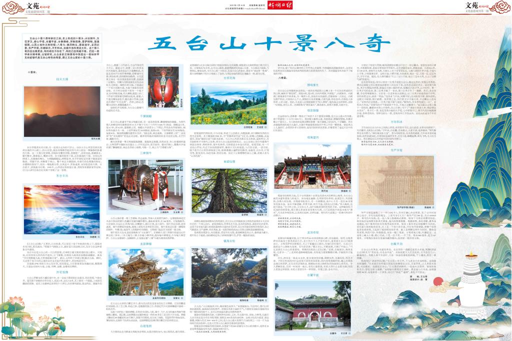 五臺山十景八奇有新舊之別,史上形成的十景為:大社銅牛、玉花羅漢、碧山字塔、臺麓字崖、古佛牌樓、羅睺現(xiàn)佛、菩薩銅鍋、顯通銅殿、山西土地和五郎鐵棍;八奇為:佛洞轉生、摩崖造字、龍洞幻景、華嚴字塔、石罅映月、萬年積冰、臺巔天池和清涼大石。這十景八奇歷經(jīng)滄桑更迭,有的現(xiàn)在不存在了,有的已經(jīng)殘破不堪。后經(jīng)一些學者長期考察,比較研究,從眾多的文物景觀中篩選出一些世所罕見的能夠代表五臺山特色的奇景,謂之五臺山新的十景八奇。