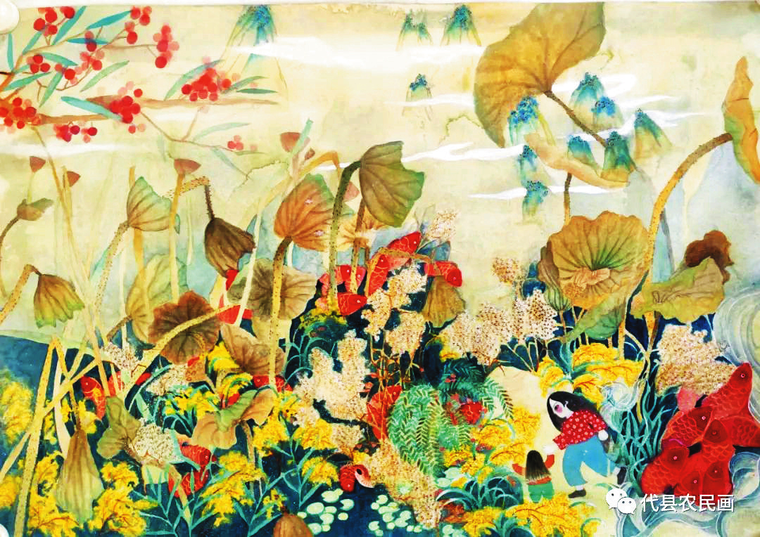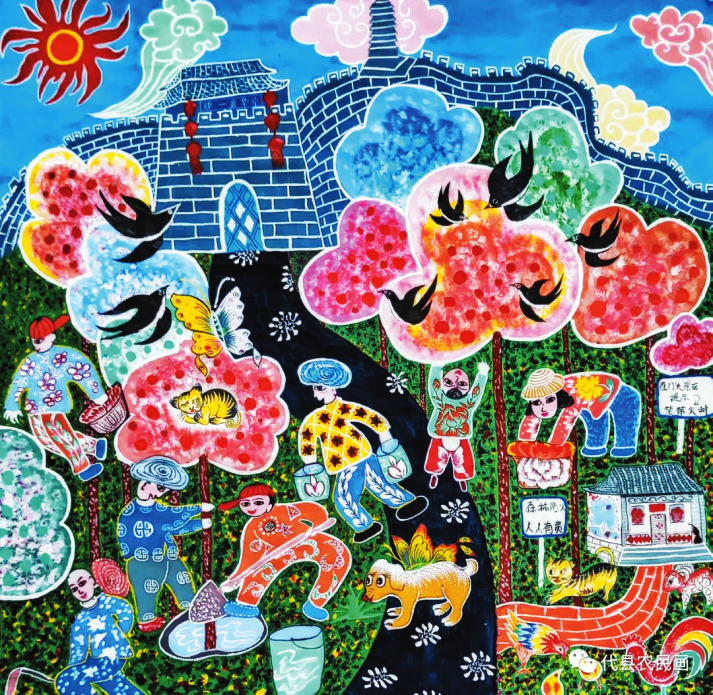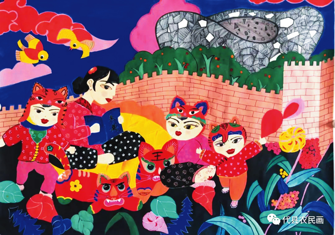 中國歷史文化名城代縣,文化底蘊(yùn)深厚,民俗傳統(tǒng)技藝精巧別致,1988年和2008年先后被文化部授予“中國民間繪畫畫鄉(xiāng)”“中國民間文化藝術(shù)之鄉(xiāng)”。該縣的農(nóng)民畫早在上世紀(jì)80年代初就在全國產(chǎn)生過較大影響,之后經(jīng)歷了一段低迷期。近年來在代縣農(nóng)民畫促進(jìn)會的推動之下,農(nóng)民畫又重新煥發(fā)出耀眼的光彩。先后涌現(xiàn)出多位畫家,其中尤以丁全愛、戴翠平、祁磊、賈永花、郎冬梅等18位女畫家組陣的雁門巾幗,在多年鉆研繪畫技巧的基礎(chǔ)上,創(chuàng)作出一幅幅特色鮮明、獨(dú)具匠心的畫作,成為閃耀三晉大地的矩陣,為傳承、弘揚(yáng)雁門文化做出了新貢獻(xiàn)。